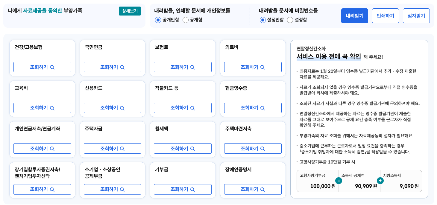 - 소득공제 자료 조회: 의료비, 보험료, 교육비, 기부금 등 다양한 항목의 자료를 조회할 수 있습니다.